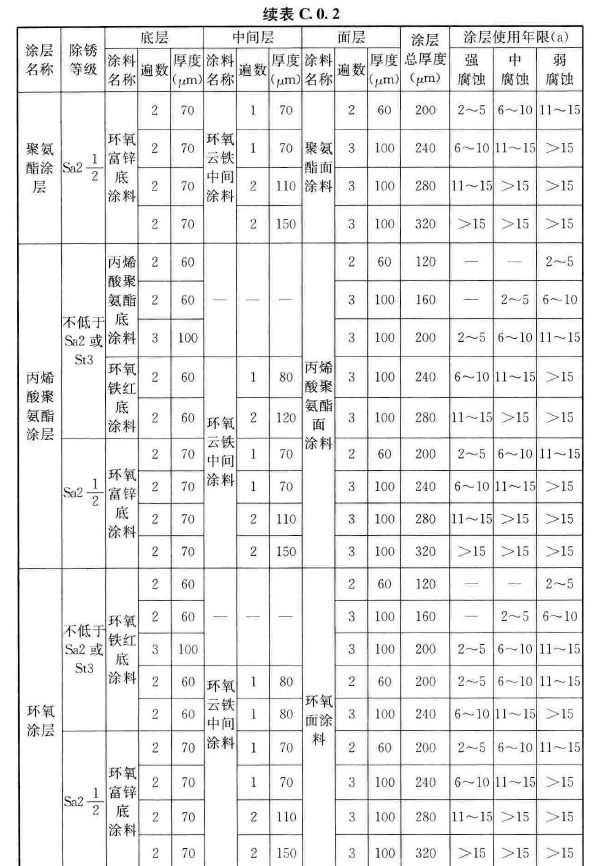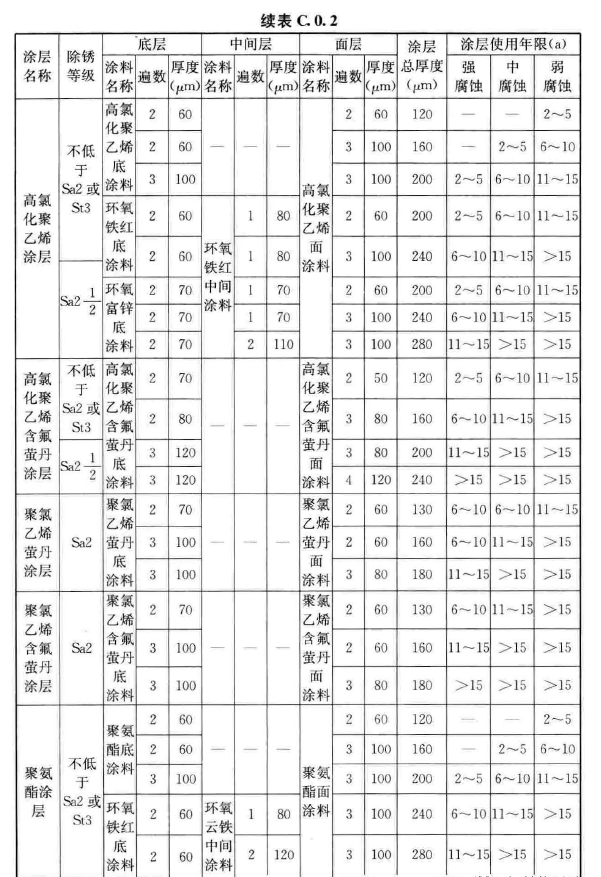 根據(jù)《工業(yè)建筑防腐蝕設(shè)計(jì)標(biāo)準(zhǔn)》GB/T 50046-2018第3.3.3條,防護(hù)層的設(shè)計(jì)使用年限應(yīng)符合下列規(guī)定: