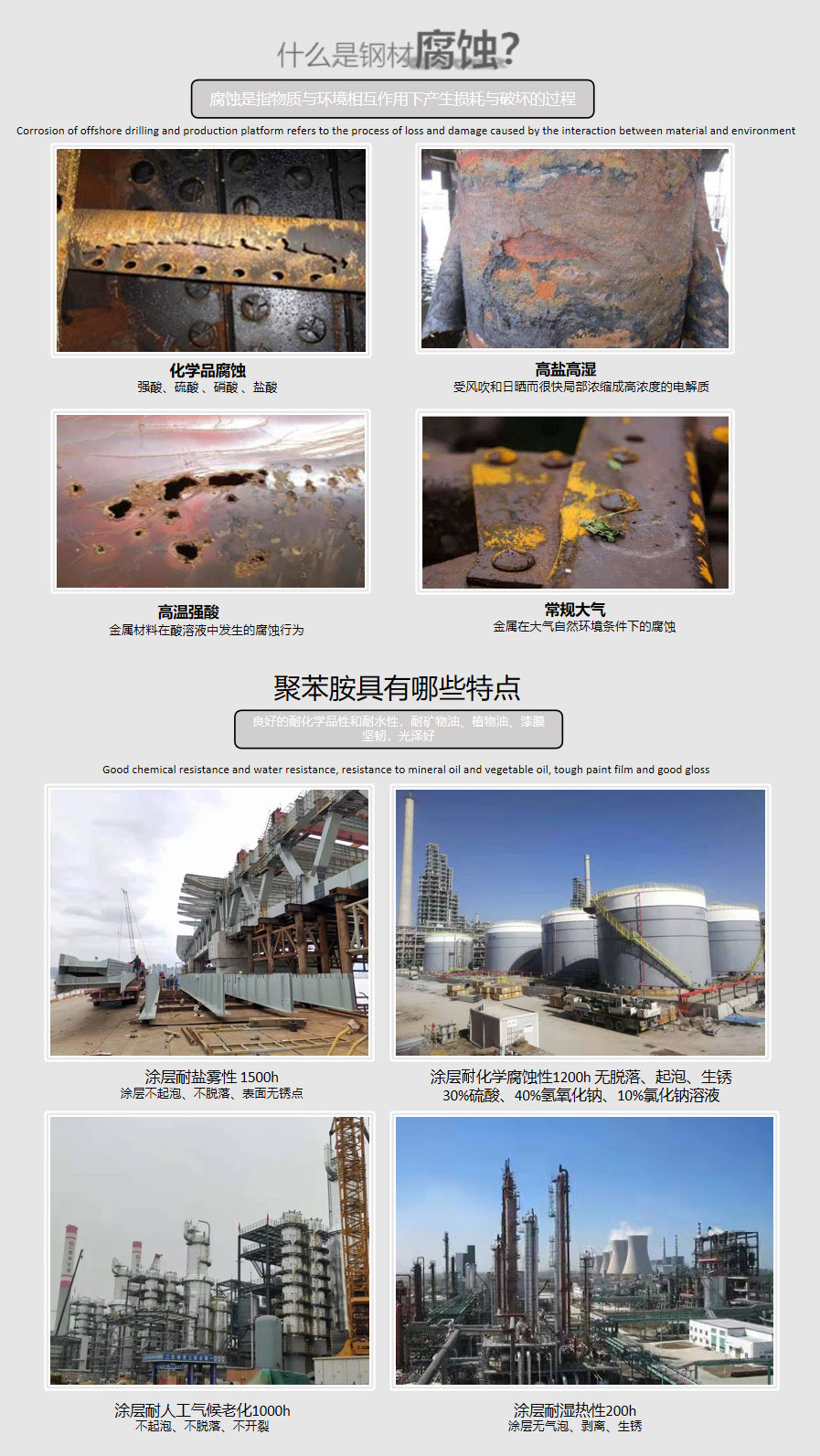 無(wú)溶劑環(huán)氧/聚氨酯體系,致密涂膜,耐酸、堿、鹽、油等化學(xué)介質(zhì)。