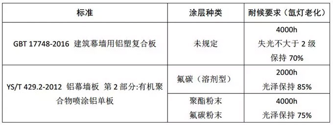 可以看出一體板的這些地方標(biāo)準(zhǔn),相對(duì)來(lái)說(shuō)弱化或規(guī)避了涂層耐候性的指標(biāo),而且未明確不同涂層種類的差別,一刀切的規(guī)定大約在1000~1500h的耐候性。這個(gè)指標(biāo)很像多彩漆和氟碳漆的耐候性之間找了一個(gè)平衡點(diǎn),其實(shí)主要原因在于我們現(xiàn)在定標(biāo)準(zhǔn)很多時(shí)候必須平衡參與的多個(gè)廠家的建議和利益,因此指標(biāo)往往會(huì)折中處理。