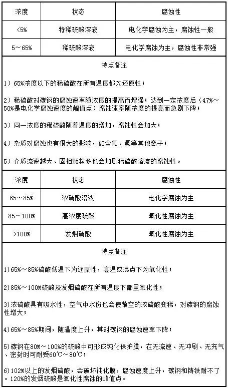 從表1《市面上的硫酸常見的濃度、狀態(tài)及腐蝕特點》可以看出,針對不同濃度,不同溫度狀態(tài)的硫酸,耐腐蝕選材也不盡相同。
