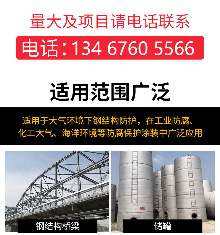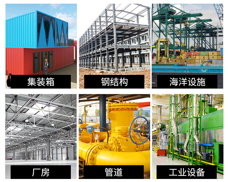 環氧云鐵中間漆適用于防腐性能要求較高的鋼鐵工件的防腐底漆或中間漆。如船舶、集裝箱、橋梁、水工閥門及構件、煤氣柜、化工容器內外壁、氟碳涂料,裝飾性聚氨酯面漆涂層用以增加厚度和豐滿度的中間涂層,環氧富鋅底漆的附加涂層等。